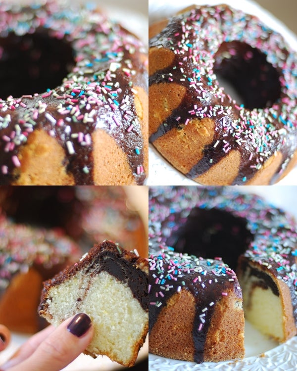 Sätt ugnen på 175 grader. Smörj och bröa en form. Smält smöret och blanda det med mjölken. Vispa ägg och socker kraftigt så det blir vit och fluffigt. Tillsätt smörblandningen, vaniljsocker och citronskal. Rör ner mjöl och bakpulver. Blanda till en jämn smet (vispa försiktigt annars blir kakan till betong) Häll 2/3 av smeten i formen. Blanda kakaopulvret utrört i vatten med resten av smeten och ringla ner den i den ljusa sme­ten. Gör lite mönster med en gaffel så färgerna blandar sig något. Grädda kakan längst ner i ugnen ca 35 minuter. Känn efter med sticka om kakan känns torr, då är den färdig.