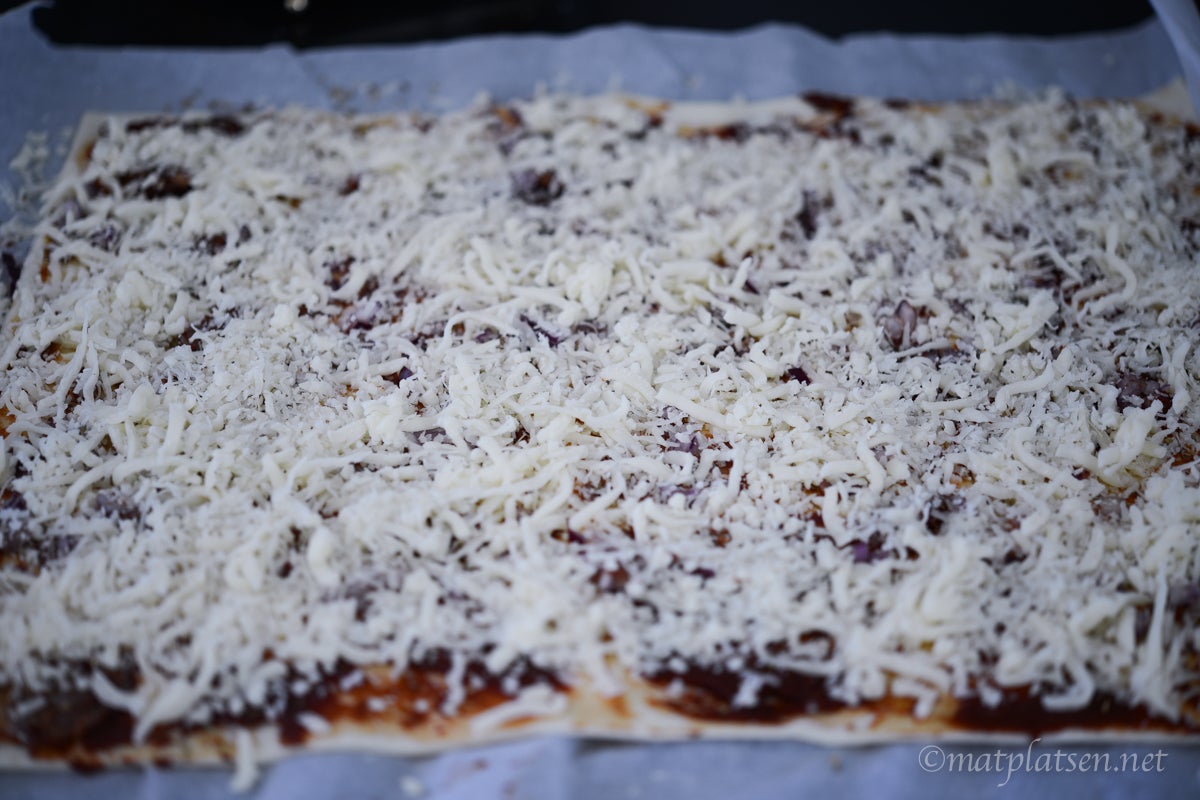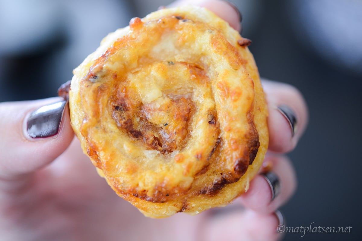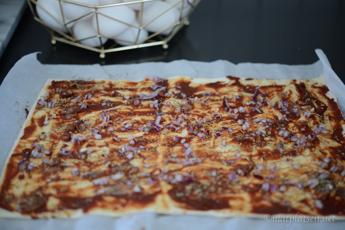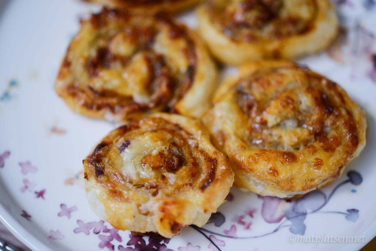 Rulla ut smördegen och bred på ett lager tomatpuré. Spritsa ut lite sardellpuré (ca 2-3 msk till ett ark) och fördela över, strö över hackad lök, krydda med oregano och avsluta med ett lager riven ost. Rulla i hop som en rulltårta och skär smala skivor. Lägg dem på en plåt med bakplåtspapper och grädda i 225 C 5-10 min tills de fått fin färg.