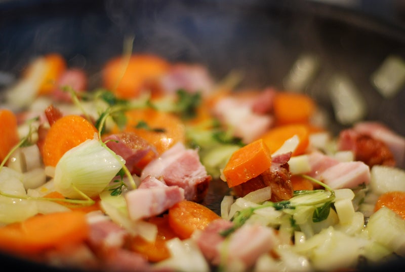 Rödvinssky: Skala lök, vitlök, selleri och morot och skär i små bitar. Strimla fläsket. Bryn grönsaker, fläsk och timjan i oljan.
