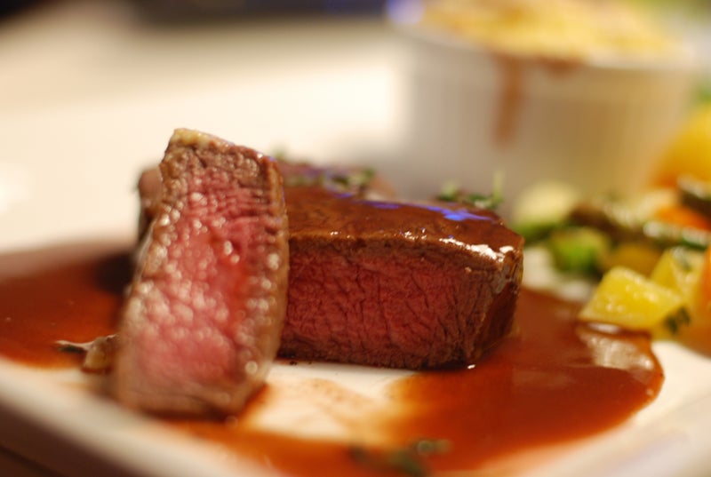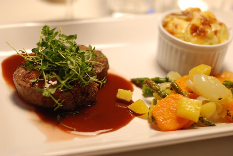 Timjanstekt oxfilé med jordärtskocksgratäng, citrongrönsaker och varmrökt rödvinssky