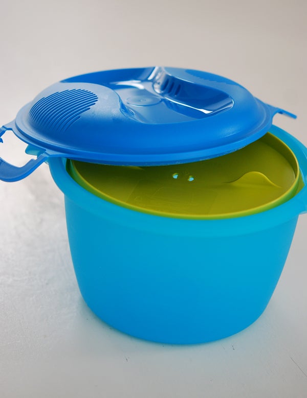 Vet ni vad det här är?? Jo det är en riskokare för micron som jag köpte på Tupperware-partyt (Desperate Housewives fínalen om ni minns). Tyckte det var så fina färger (viktigt eller hur 😉 ) och lät så smidigt. Jag är nämligen riktigt usel på att koka ris i kastrull. Det blir grötigt, kladdigt, överkokt eller underkokt, och gärna fastbränt. Men i den här, då lyckas jag alltid!!