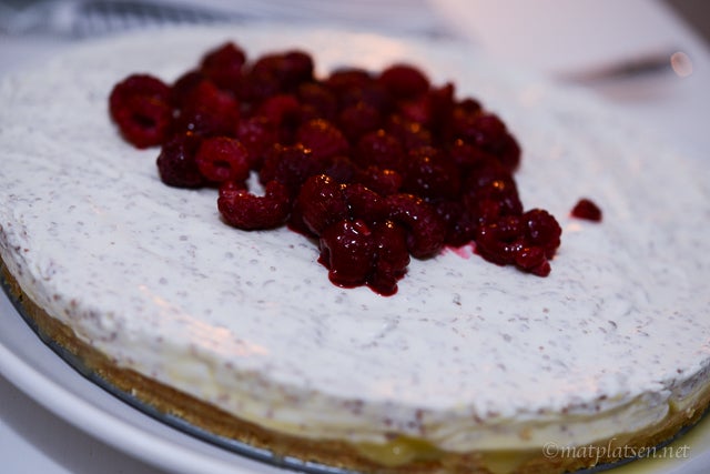 Botten: Smält matfettet. Mixa kex och matfettet i en matberedare. Tryck ut kexblandningen i en form med löstagbar kant, ca 24 cm i diameter (för 12 port). Sätt in i kylskåp så att botten stelnar.