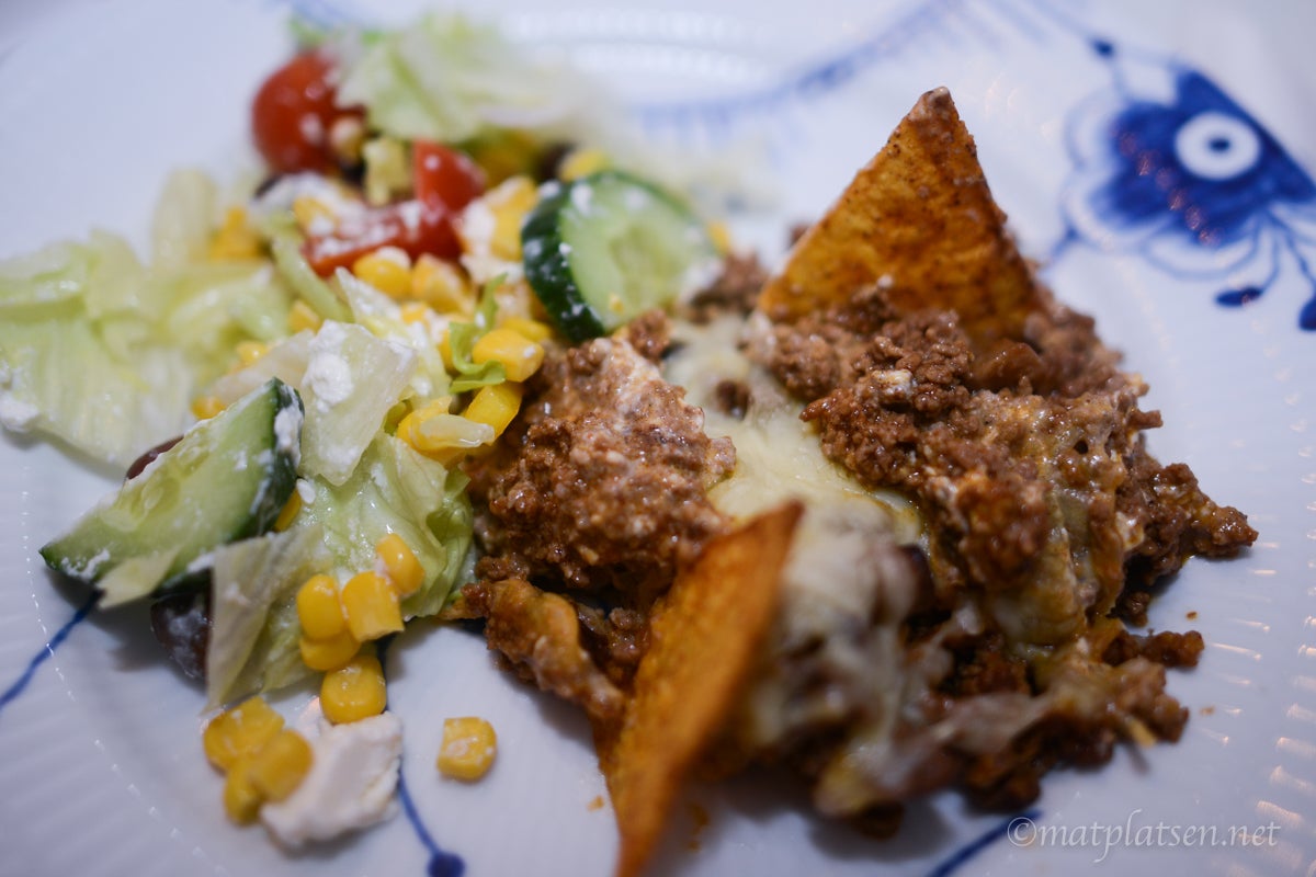 12 tjejer på middag – inte det lättaste att planera mat. Det fick bli tacogratäng i långpanna. Riktigt länge sen jag åt men det är ju faktiskt himla gott och enkelt! Satsa på en god köttfärs bara och låt den gärna koka länge länge så blir det extra gott (lät min gå nästan 2 h och köpte finmald nymald nötfärs från lokala gårdar). Finns säkert en hel uppsjö med recept på tacogratäng men så här gör jag min: