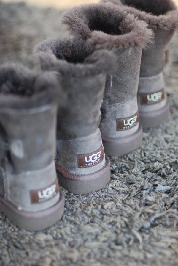 Barnens UGGs väntar på att få komma ut och lufta sig. Det gick ju bra när det var isande krispig vinter, då värmde de gott, men sen började ju våren göra sitt intåg och nu droppas det och samlas vattenpölar överallt så UGGsen får snällt vänta inne lite. Jag kanske hinner hitta ett par matchande till mig så länge? Sålde mina och har bara ett par paljettprydda kvar. Känns lite tooo much till vardags, även för mig ;)) Så nu letar jag neutralare färg, halvhöga och stilrena. Helst grå/bruna likt kidsens (och Mickes) men det verkar inte finnas?