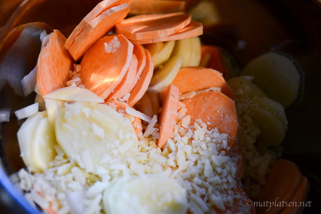 Skala och skär potatissorterna i skivor (det ska vara ungefär samma mängd av dem). Lägg ie n skål och blanda med pressad vitlök, skivad lök, riven ost, grädde, salt & peppar. Häll över i en ugnsform och hyvla över lite smör överst. In i ugnen, 225 C, ca 30 min tills potatisen är mjuk.
