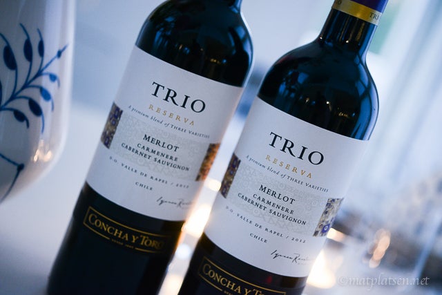 Först ut: TRIO Reserva från Chile. Vinerna i TRIO-serien är alla gjorda på tre druvsorter, detta på Merlot, Carmenère och Cabernet Sauvignon. (finns på systembolaget HÄR).