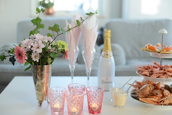 Dukade upp med champagneglas (godaste formen att dricka champagne ur tycker jag! dessa frågar ni alltid om, märket är C&S – chef & sommelier) nya servetter och härliga ljuslyktor från Borett, vas Day Home och våningsfatet med skaldjur på Royal Copenhagen Mussel Malet.