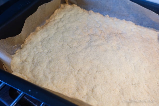 Lägg ett bakplåtspapper i en form, 20 x 30 cm. Blanda samman ingredienserna till botten och tryck ut i formen. Grädda i 175 C ca 15 min.