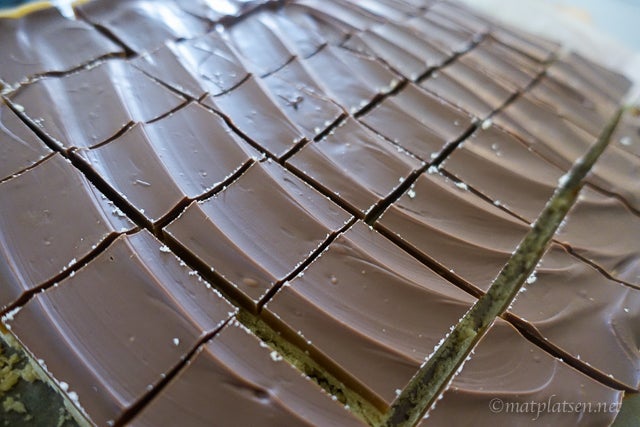 Lägg alla ingredienser till kolan i en stor kastrull och låt koka upp under omrörning på medelvärme tills den tjocknat och klarar kulprovet. Det tar ca 45 min. Häll kolan över den svala kakan och ställ kallt. Smält chokladen över vattenbad och bred sedan ut den över den kalla kolan. Låt chokladen stelna. Skär sedan kakorna i bitar (ska ej vara för kall då blir det svårt!).