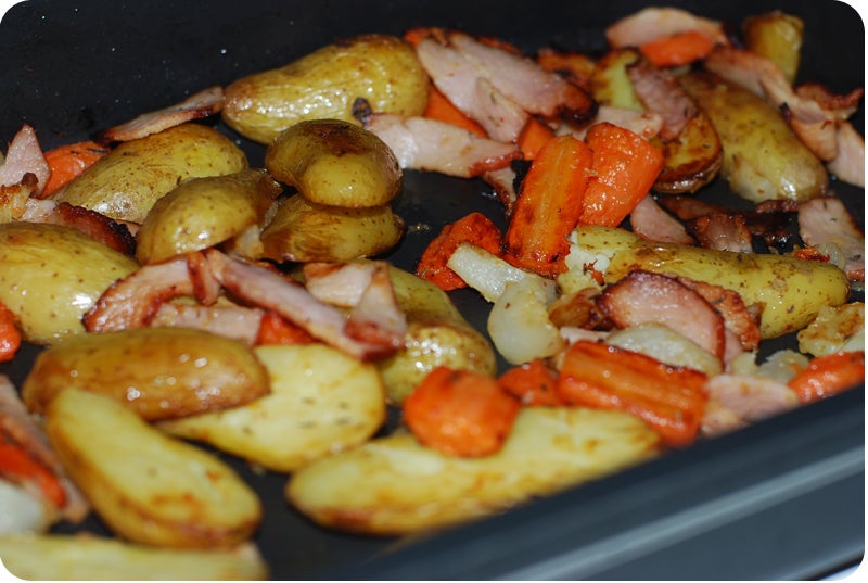 Sätt ugnen på 225°C. Skala morötter och majrovorna. Skär rotfrukterna och potatisen i bitar. Blanda rotsakerna med timjan, oljan, salt och peppar på en plåt. Rosta i mitten av ugnen ca 30 minuter. Strimla kasslern och blanda med rotsakerna på plåten när det återstår 10 minuter av tillagningstiden.