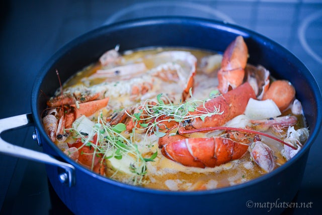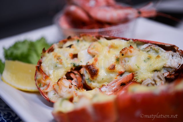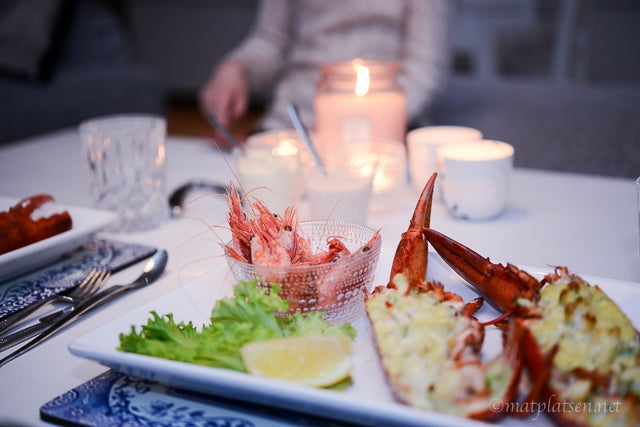 Jag gillar vardagslyx och guldkant på tillvaron, det vet ni väl vid det här laget 🙂 Men det behöver inte kosta multum för det. Om man inte vill. Vill man käka rysk kaviar varenda dag får man gärna göra det för mig 🙂 Vi hittade iallafall billig färsk hummer på nya Ica Maxi som öppnat i våra krokar, tjoho! Åt dem härom dan gratinerade med lite tillbehör och sedan kokade jag såklart en god fond på skalen. Kasta aldrig – koka fond och frys in och ha till soppor och såser, finns inga köpa-fonder i världen som smakar i närheten lika gott! Så får man ju mer valuta för pengarna också.