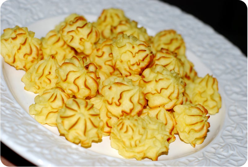 Gör potatismos som ni brukar och blanda bara i äggula i och spritsa ut på bakplåtspapper. Superenkelt men mycket festligare!