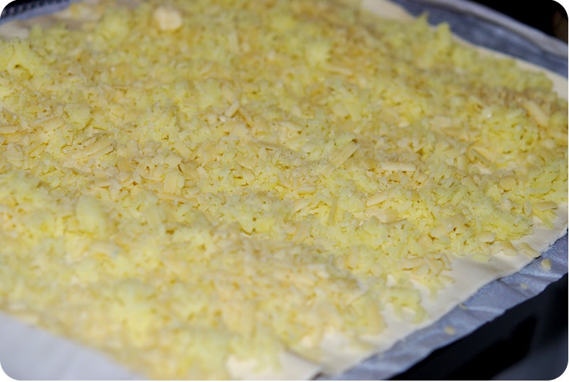 Bred ut arket med smördeg. Pressa potatisen och strö över. Strö ett lager ost över det, salta & peppra.