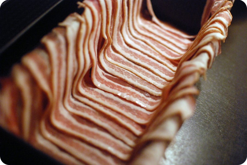 Sätt ugnen på 185 grader. Kläd en avlång sockerkaksform med baconskivorna genom att lägga skivorna rakt över formen så att ändarna hänger ut på kanterna. Lägga baconskivorna som ”takpannor” där skivorna överlappar varandra.