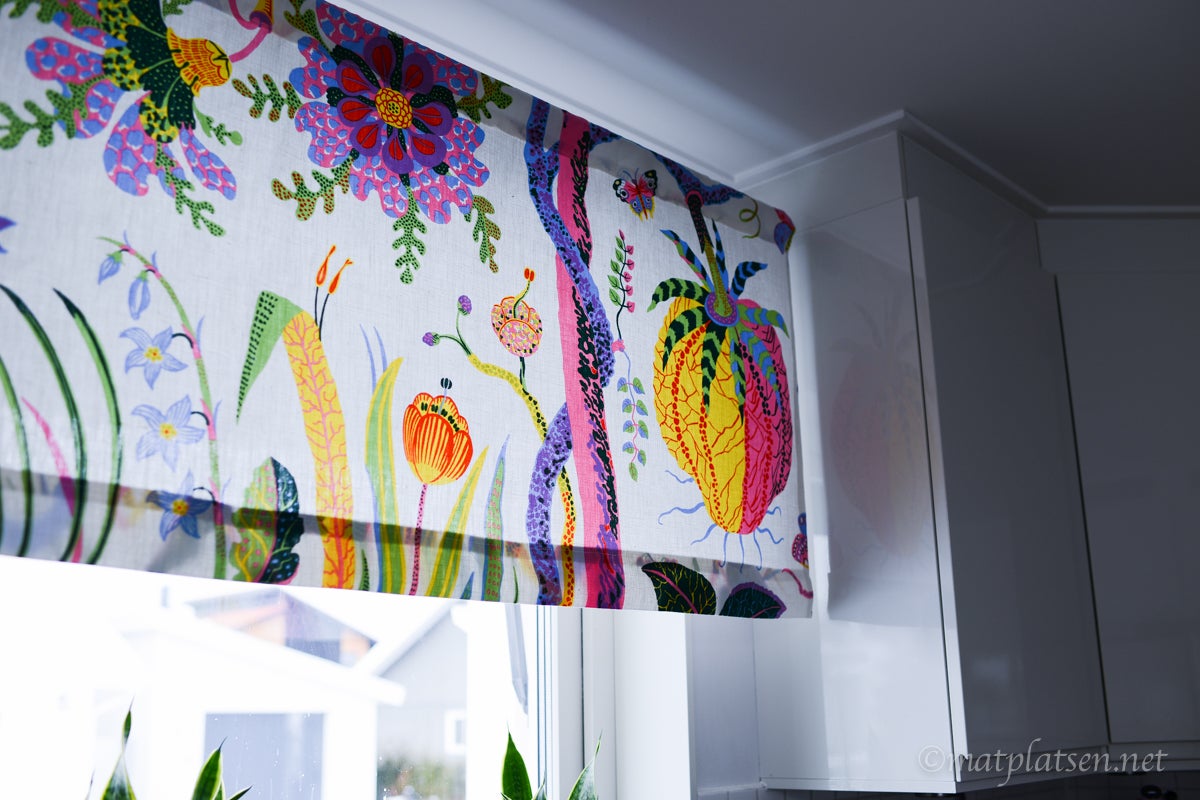 Ny vårig gardin i köket som mamma sytt, blir glad bara jag ser den trots att snön ligger tjock utanför och det viner sibirisk kyla om knutarna. (Tyg från Svenkt Tenn)