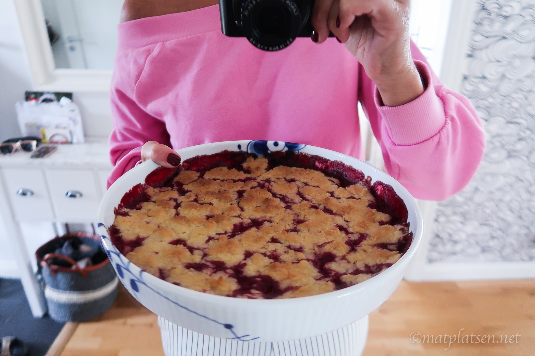 Smält smöret och blanda med de övriga ingredienserna. Lägg de tinade hallonen i en pajform och försök fördela smeten någorlunda jämt över. Grädda i ugnen 200 grader i ca. 20-30 minuter.