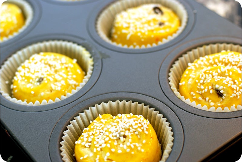 Pensla med uppvispat ägg och strö över rikligt med pärlsocker. Ställ gärna formarna i en muffinsplåt, då håller de formen och flyter inte ut under gräddningen!
