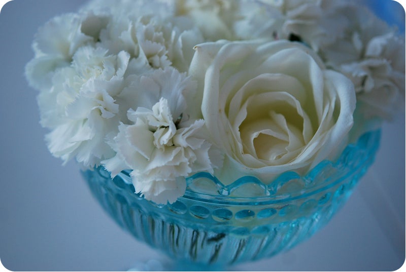 Blombuketter som sjunger på sista versen brukar jag suga ur det sista av genom att klippa av de blommor som fortfarande är pigga och sticka ner i en fin skål fylld med vatten.