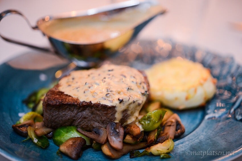 Oxfilé med potatissnurror, murkelsås och brysselfräs, HÄR