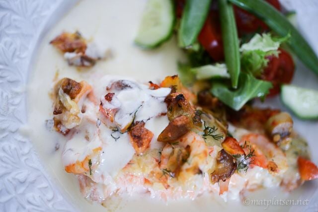 Idag åt vi laxen till middag, fast utan skaldjurstopping för det hade vi inte hemma. Men ååh så gott det blev ändå. Hällde över såsen innan jag satte laxen i ugnen. Så enkelt men så himla gott, älskade såsen 😋