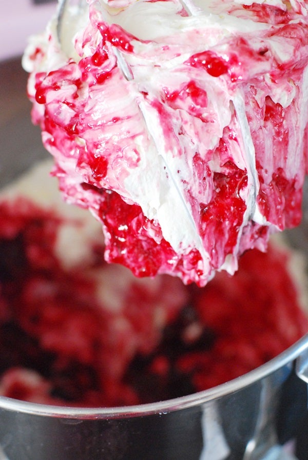 Vispa under tiden samman mascarpone, grädde, socker samt vaniljpulver i maskin till en fluffig, fast kräm. Tillsätt sedan körsbärsmarmeladen. Vispa så allt blandas jämt.