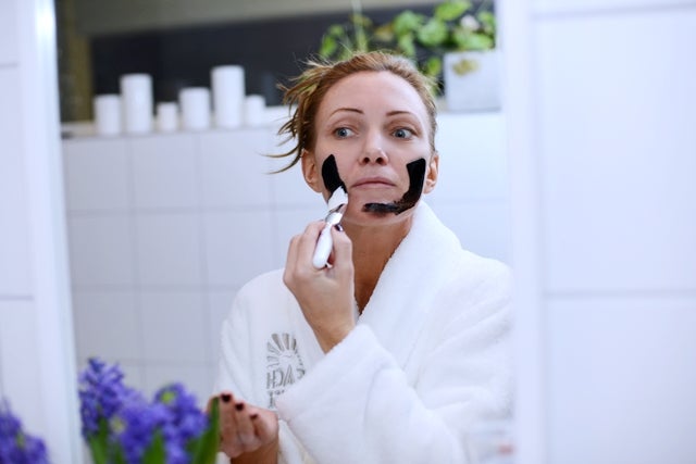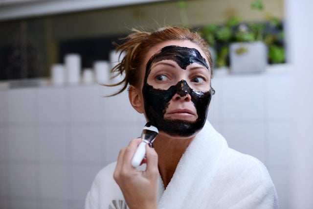 Ansiktet tvättas med varmt vatten och sen var det bara att pensla på masken och låta sitta 35-40 min tills den stelnat och går att dra av likt en gummimask.