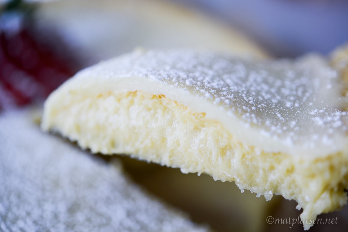 Glasyr: Koka upp grädden. Ta den från värmen och tillsätt chokladen och rör om tills den smälter. Låt glasyren halv-stelna ca 5 min i kylen. Bred glasyren över kakan och låt den stelna i kylen. Sikta över florsocker.