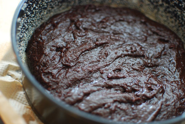 Smöra en form med löstagbar kant (ca 20 cm) och bröa den med ströbröd. Sätt ugnen på 175 grader. Rör i hop de torra ingredienserna och tillsätt sen smöret och sist äggen. Rör ner chokladkrosset och häll över smeten i formen. In i mitten av ugnen ca 20 min. Klassiker!