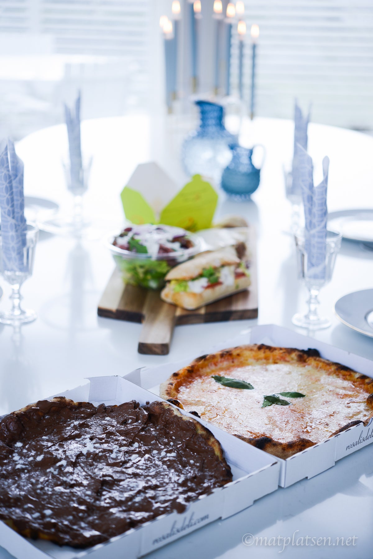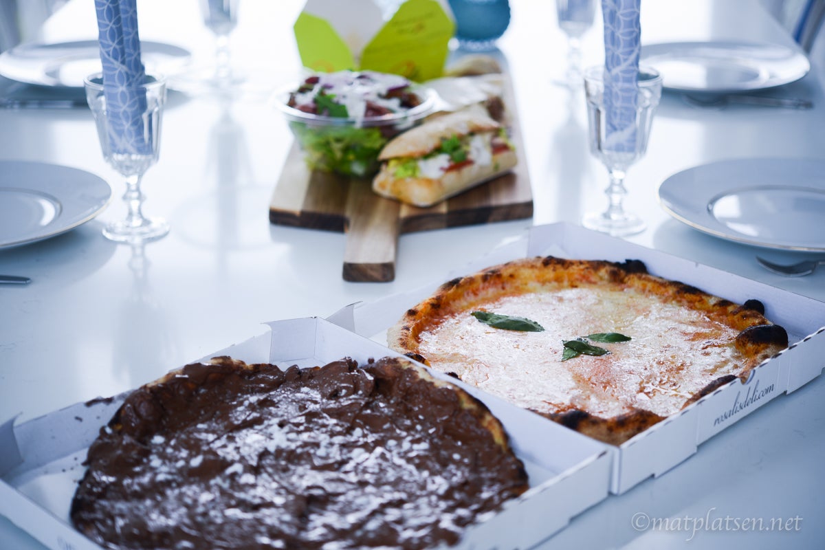 Provade ett beställa hem middag i dag, ingen hade lust att åka i väg i regnet och ingen hade ork att laga något – så det passade ju perfekt. 30 minuter senare stod här en rykande färsk nutellapizza (som var så gaaalet god!!!) en margarita, lasagne, grillad chiabatta, wrap med pulled pork och en chevresallad med parmaskinka. (Beställde från Rosalis).